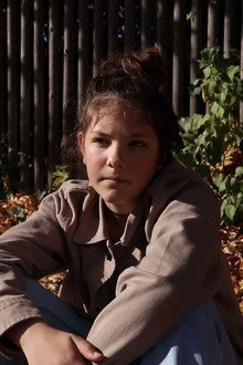 A girl sitting on an autumn leaf-filled sidewalk communicates with a mysterious figure across the street.