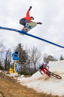 Mountain bikers Jaxson Riddle and Carson Storch, and snowboarders Luke Winkelmann and Sean Fitzsimmons create a unique course that sees them ride alongside and over each other on dirt and snow trails.