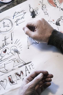 An artist draws the scenes to the lyrics at pace with the song.
