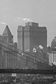 Morning reveals New York harbor, the wharves, the Brooklyn Bridge. A ferry boat docks, disgorging its huddled mass. People move briskly along Wall St. or stroll more languorously through a cemetery. Ranks of skyscrapers extrude columns of smoke and steam. In plain view. Or framed, as through a balustrade. A crane promotes the city's upward progress, as an ironworker balances on a high beam. A locomotive in a railway yard prepares to depart, while an arriving ocean liner jostles with attentive tugboats. Fading sunlight is reflected in the waters of the harbor. The imagery is interspersed with quotations from Walt Whitman, who is left unnamed.